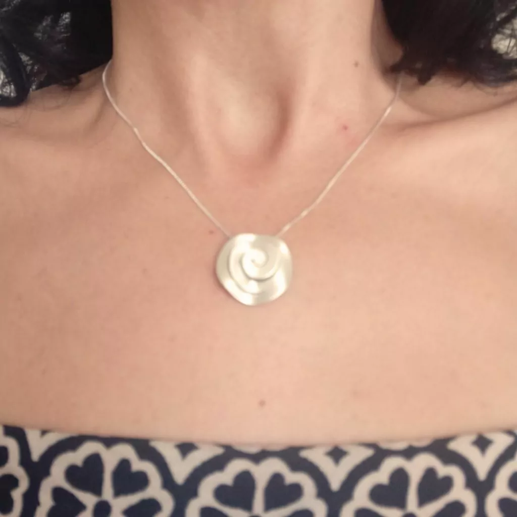 O Colar Girinho Médio é feito em prata 950. Com um diâmetro de 2,5 cm, este colar é versátil e elegante. Acompanha uma corrente de prata para uso imediato e um cordão em camurça que adiciona um toque de suavidade ao seu visual.